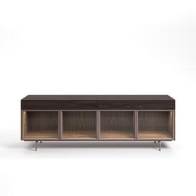 Exemplifying modern luxury, the Link dining room epitomizes sleek sophistication The dining table in walnut finish is complemented by chic, upholstered chairs that exude comfort and style. Sleek and spacious credenza and display cabinets embody modern sophistication and elevate any dining space with their timeless allure.