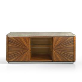 Marble top. Two doors with touch-latch system. Wood shelves inside. Two glass shelves in the central section. Metal base. Stainless steel decorative trim under the top.