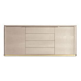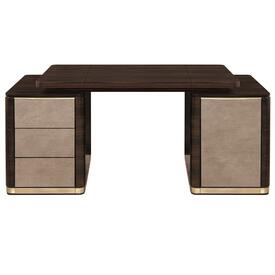 Leather on top. Left pedestal with 3 drawers. Right pedestal with 1 top drawer and 1 filing drawer. Both sides lock. Front with 2 hidden doors and 1 adjustable wood shelf inside. Can optionally be equipped with a built-in power unit.
