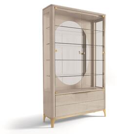 Two glass doors. Two drawers with leather on front. Upper drawer with soft-close mechanism. Bottom drawer with touch-latch system. LED lighting. Oval mirror in the back panel. 4 glass shelves. Brass base with legs.